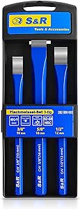 S&R SET OF 3 CHISELS FOR MECHANIC AND MASONER ➡️ Set of 3 chisels for mechanic and mason includes 3 cold flat hand chisels of various sizes: 16 x 170 mm, 12 x 150 mm and 10 x 140 mm, offering flexibility in machining operations.